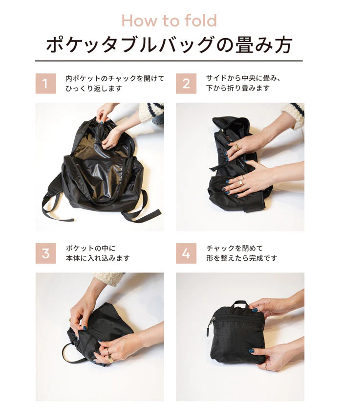 收納步驟:將背包向內摺疊,塞入自帶的內袋中並拉上拉鍊,即可完成收納。